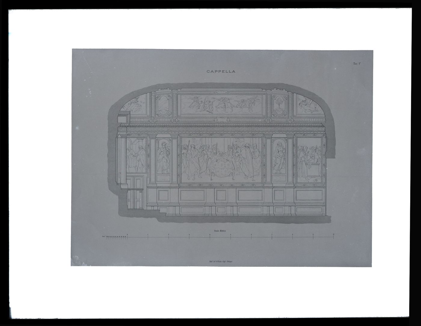 Descrizione: [Cappella: tavola V in Archiginnasio di Bologna, omaggio del Collegio degli ingegneri ed architetti di Bologna agli scienziati commemoranti l'ottavo centenario dello studio bolognese / Anonimo ; Raffaele Faccioli] ; Stab. Lit. G. Wenk e Figli, Bologna. - [esecuzione 1935-1940]. - 1 fotografia: vetro, negativo, b/n ; 18 x 24 cm.