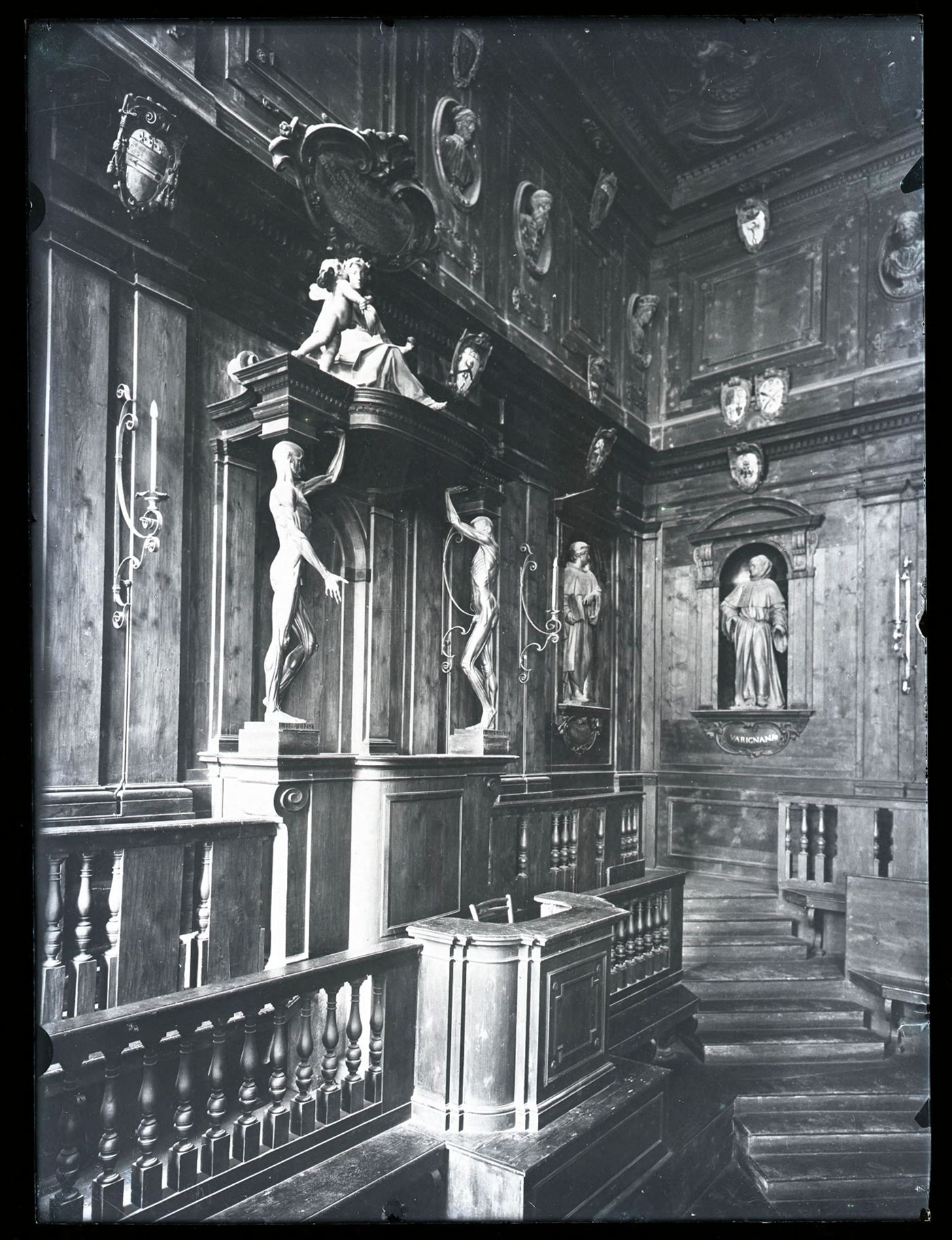 Descrizione: [Aula VI degli artisti (Teatro anatomico): parete sud: Archiginnasio: Bologna / Foto A. Villani e Figli]. - [esecuzione 1935]. - 1 fotografia: vetro, negativo, b/n ; 24 x 18 cm.