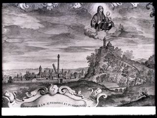 Panorama di Bologna: miniatura in Insignia degli anziani e dei gonfalonieri di giustizia del Comune di Bologna, volume XIII, carta 40, marzo-aprile 1723: Archivio di stato di Bologna