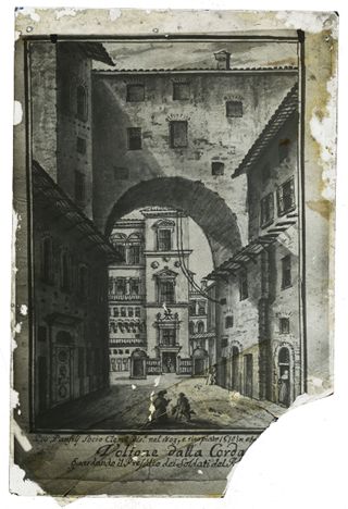 Descrizione: Voltone dalla Corda: Guardando il presidio dei soldati del P[apa] / Pio Panfili Socio Clem. dis. nel 1803, e ricopiato 1810 in età [d'anni 87 ; Anonimo]. - [esecuzione 1900 circa]. - 1 diapositiva: vetro, b/n ; 15 x 10 cm.
