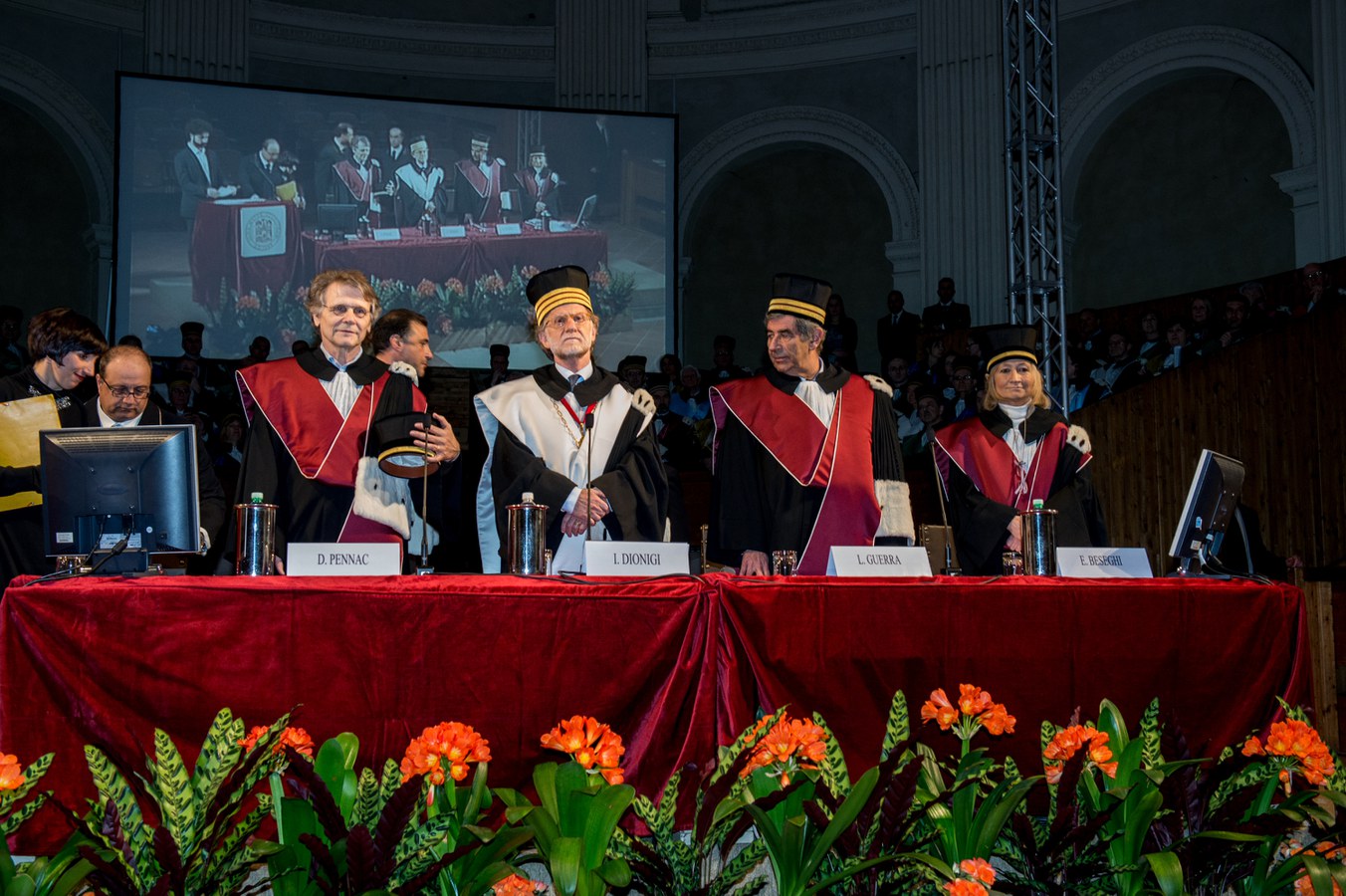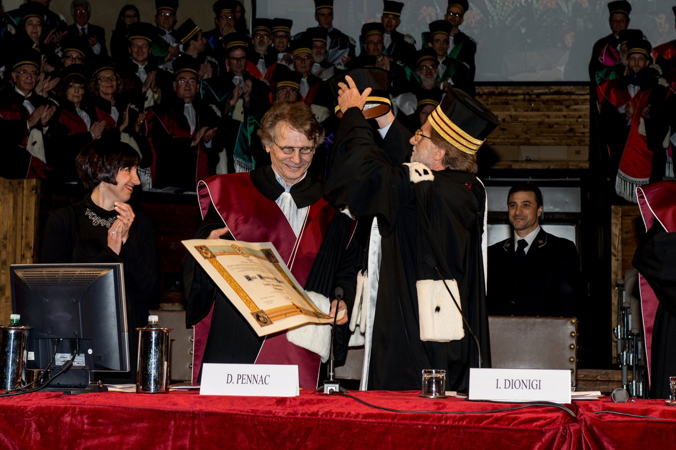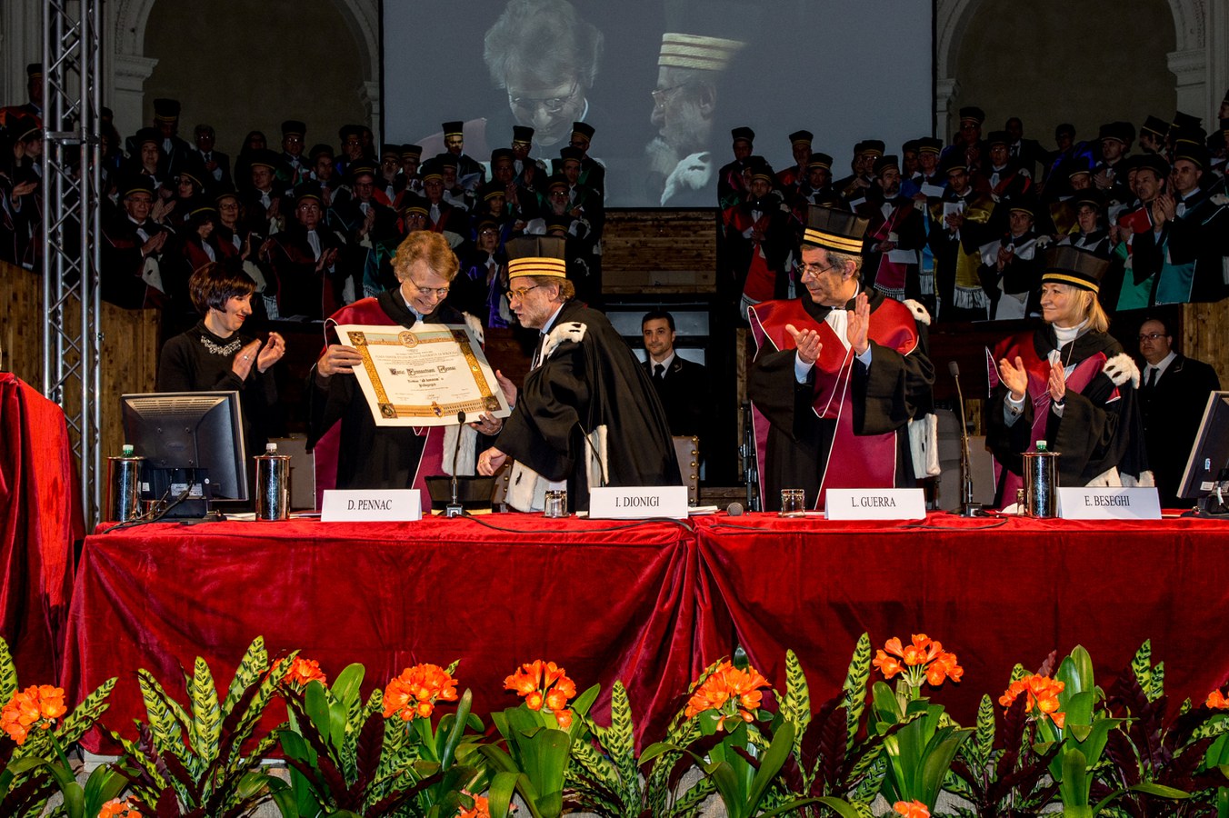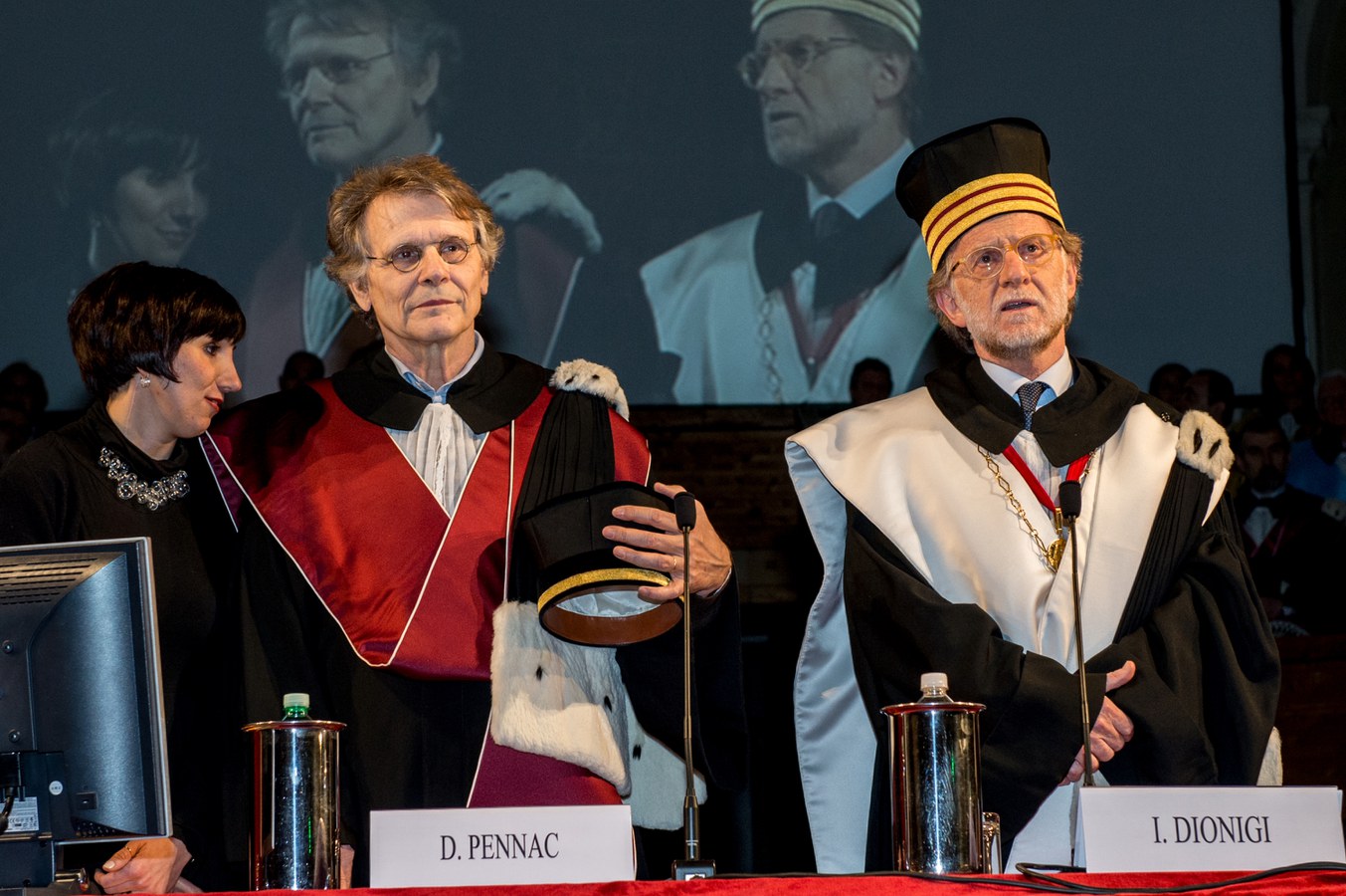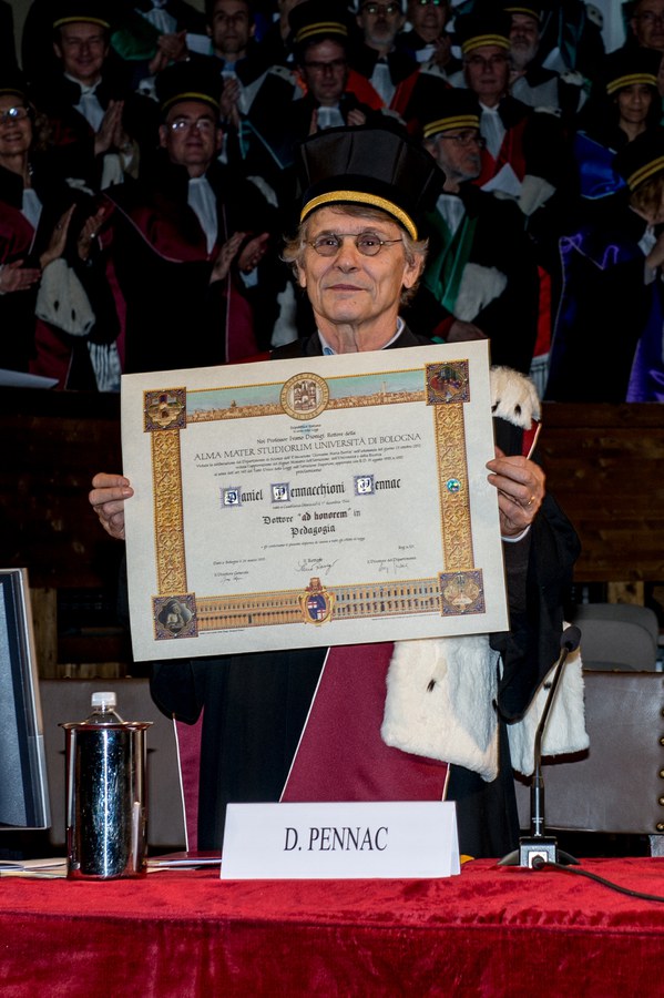 Il 26 marzo, alle 17, presso l'Aula Magna di Santa Lucia, l'Università di Bologna ha conferito la laurea ad honorem in Pedagogia allo scrittore Daniel Pennac. Pennac, autore prolifico non solo di romanzi e saggi critici, ma anche di racconti, sceneggiature per fumetti, drammaturgie teatrali, albi illustrati, è uno scrittore attento ai temi dell'infanzia e ha composto indimenticabili ritratti infantili. La laurea ad honorem, proposta dal Dipartimento di Scienze dell'Educazione, gli è stata conferita "per il suo costante impegno sul fronte della pedagogia della lettura e della riflessività pedagogica, per aver posto la necessità del leggere al centro dell'azione educativa, per la sua mirabile attenzione allo sguardo, al vissuto, ai diritti propri dell’infanzia e dell’adolescenza, cui dedica le pagine più intense della sua produzione letteraria e saggistica, per la sensibilità sempre dimostrata nei confronti di coloro che meno riescono ad integrarsi all’interno delle istituzioni educative e per le strategie ideate e condivise per coinvolgere gli studenti meno ‘bravi’ in termini strettamente scolastici e conquistarli alla passione per la conoscenza".