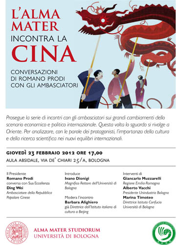 A distanza di un mese dalla chiusura dell’Anno della cultura cinese in Italia, l’Università di Bologna ospita l’Ambasciatore cinese Ding Wei in dialogo con Romano Prodi. L’evento – giovedì 23 febbraio, alle 17, nell'Aula Absidale di Santa Lucia - si inserisce nell’ambito della serie di incontri organizzati dall’Alma Mater Studiorum con gli ambasciatori dei Paesi che si pongono al centro degli scenari globali: dopo il Brasile è la volta della Cina, un paese che negli ultimi trent’anni ha sorpreso il mondo per le cifre del suo straordinario sviluppo economico e per il suo crescente protagonismo nel contesto internazionale.