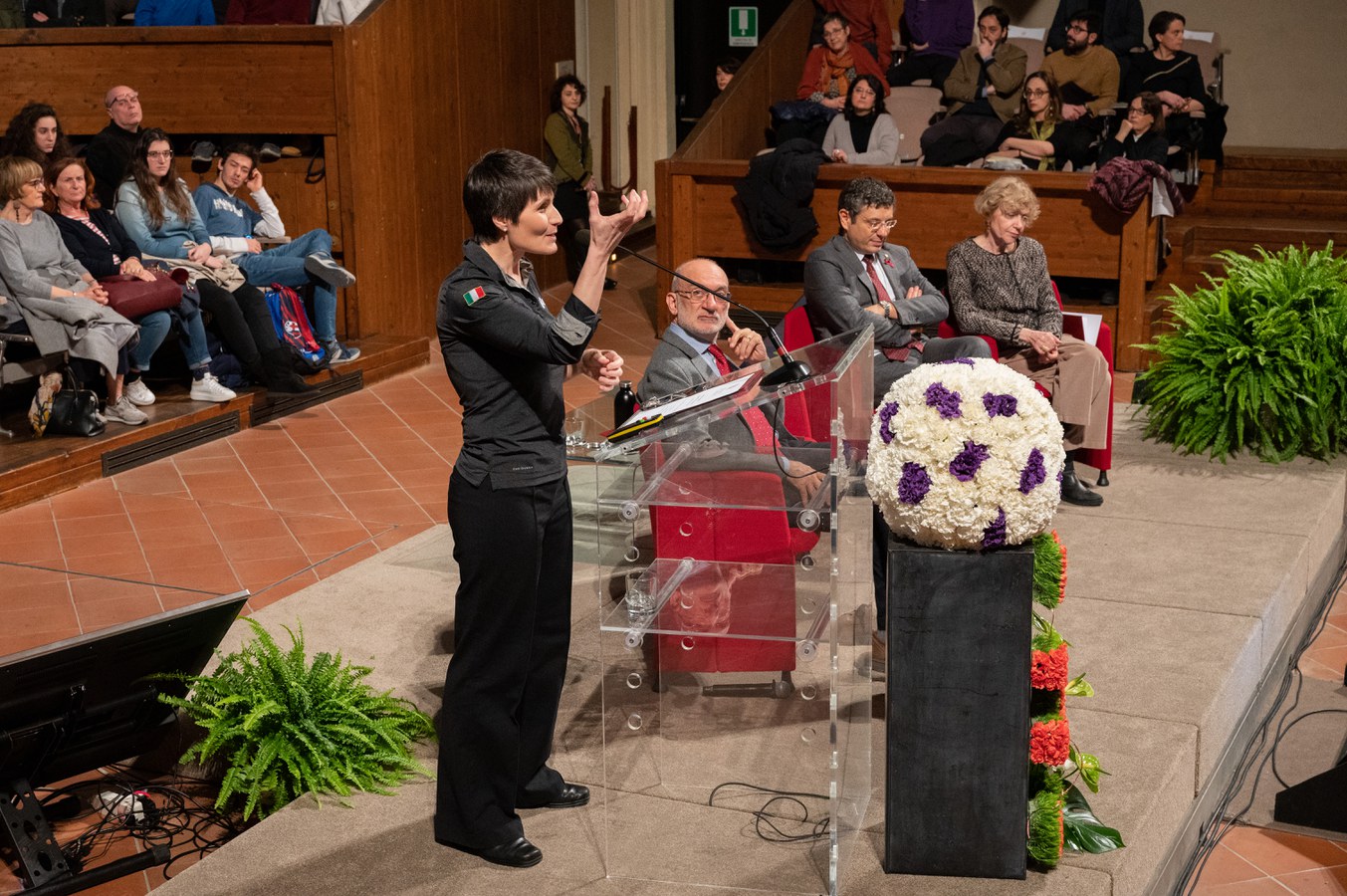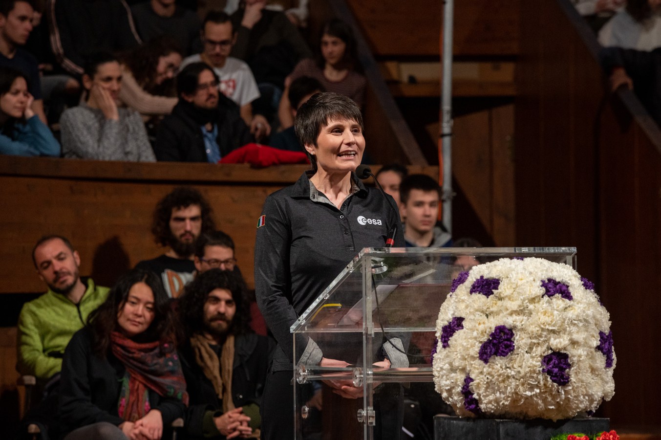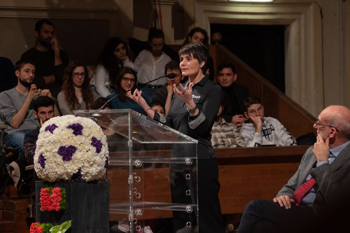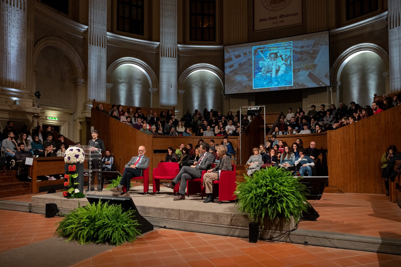 Dopo i saluti di apertura del Rettore Francesco Ubertini, e una breve presentazione da parte dell’ex-Direttore del Centro “Umberto Eco”, Patrizia Violi, e dell’attuale Direttore, Costantino Marmo, Samantha Cristoforetti ha raccontato la sua esperienza di astronauta.