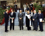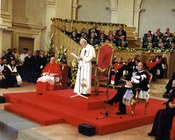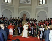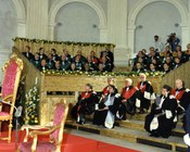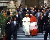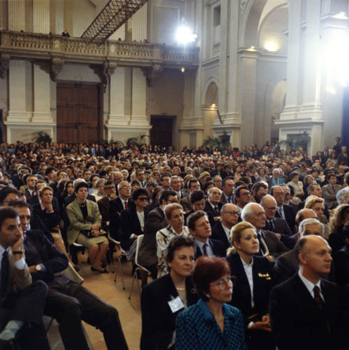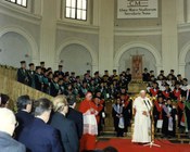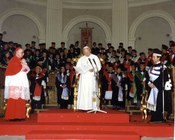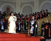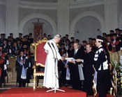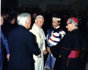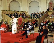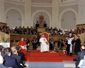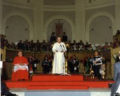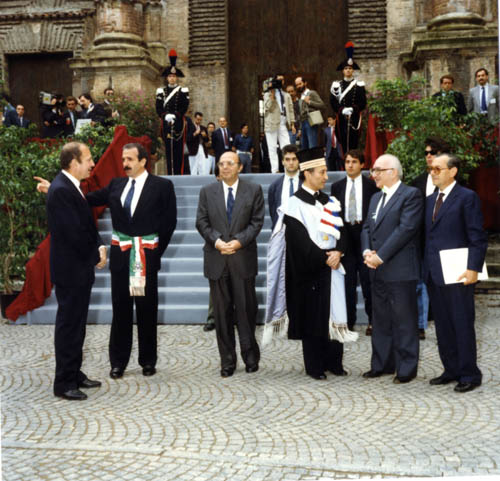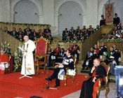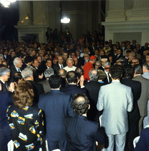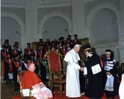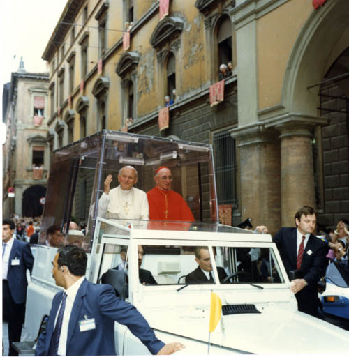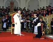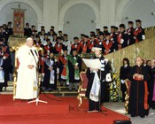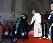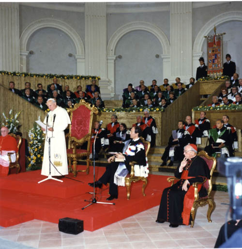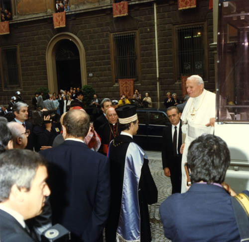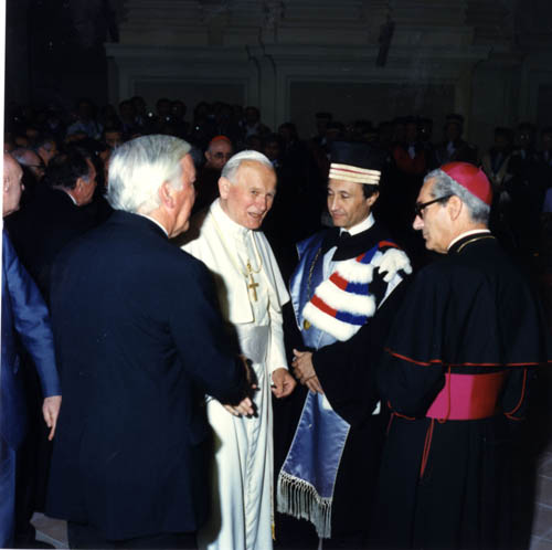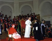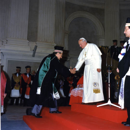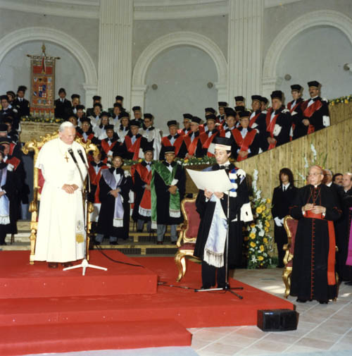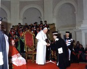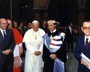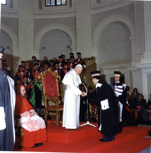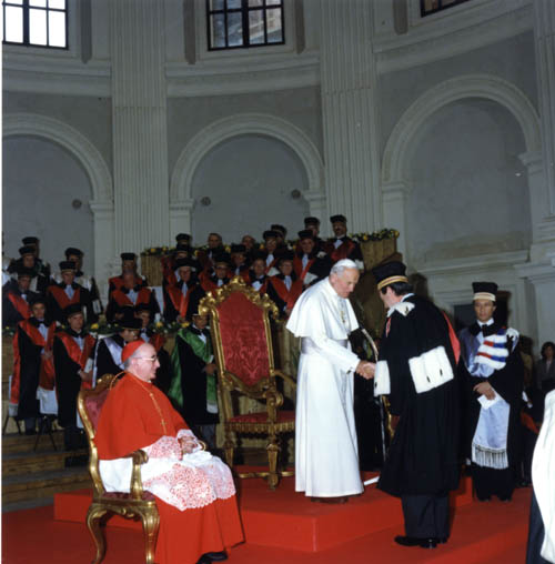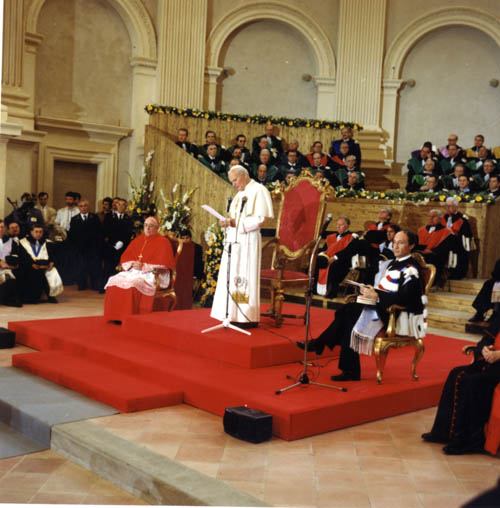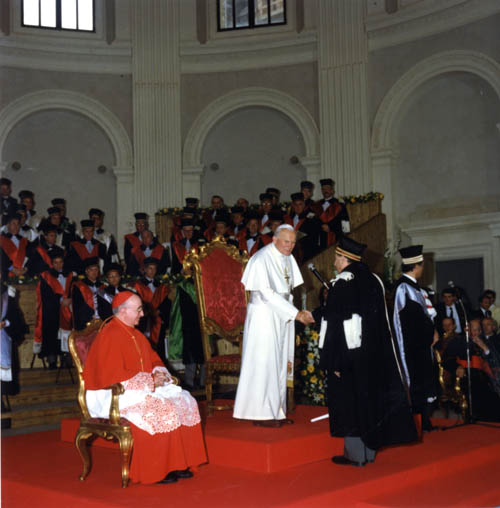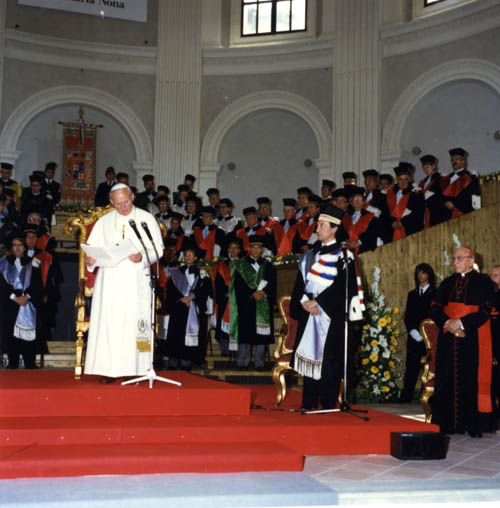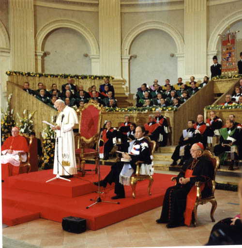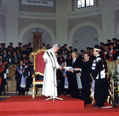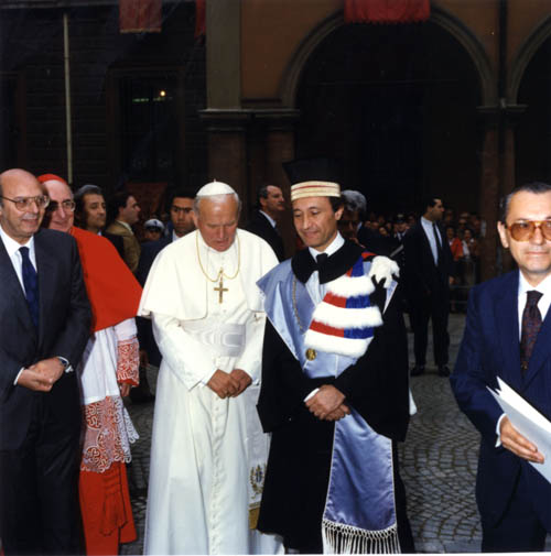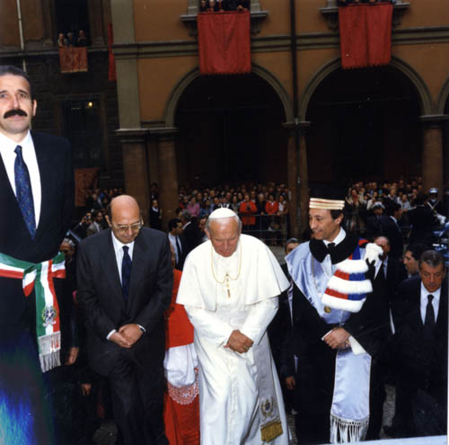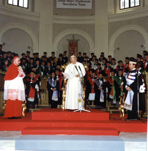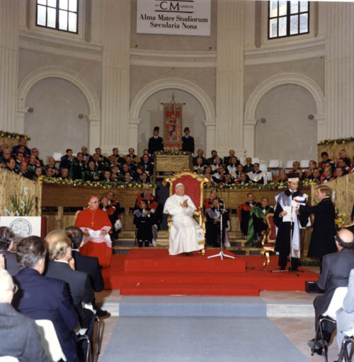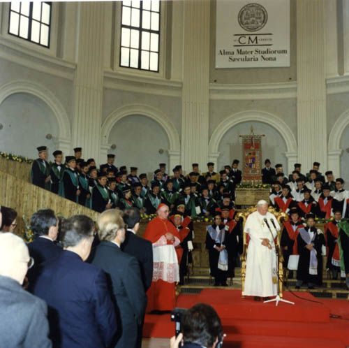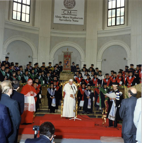 Tra i tanti avvenimenti delle manifestazioni del Nono Centenario, che così fortemente hanno caratterizzato la vita culturale della città, le visita del Papa è sicuramente uno dei momenti più solenni. Dopo un ampio excursus storico, una galleria di tutti i grandi che a Bologna hanno studiato o insegnato, il Rettore ha proclamato Giovanni Paolo II "Maestro dello Studio bolognese" aggiungendo che, con questo gesto, "l'Università di Bologna ribadisce il suo impegno intellettuale a far sì che la legge canonica sia, oggi come fu nel Medioevo, oggetto di approfondimento intellettuale e generi un nuovo motto di cultura". Nel suo discorso il Papa ha ricordato che sin dalle origini "in un mondo largamente dominato dalla forza e dall'abitudine del sopruso, proprio nelle sedi universitarie si andò a poco a poco affermando il primato della ragione della ragione del diritto".