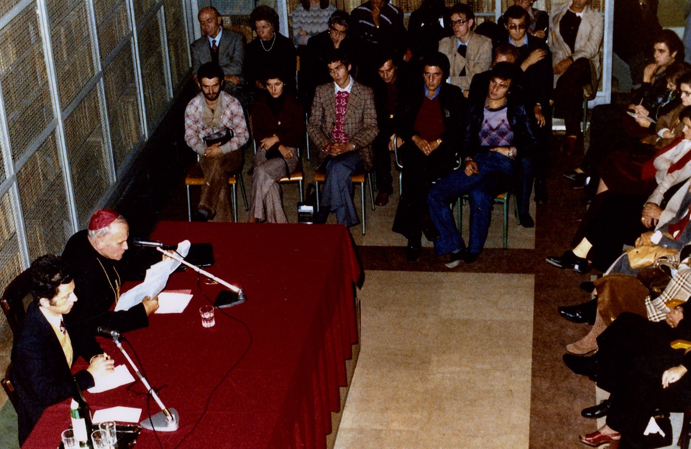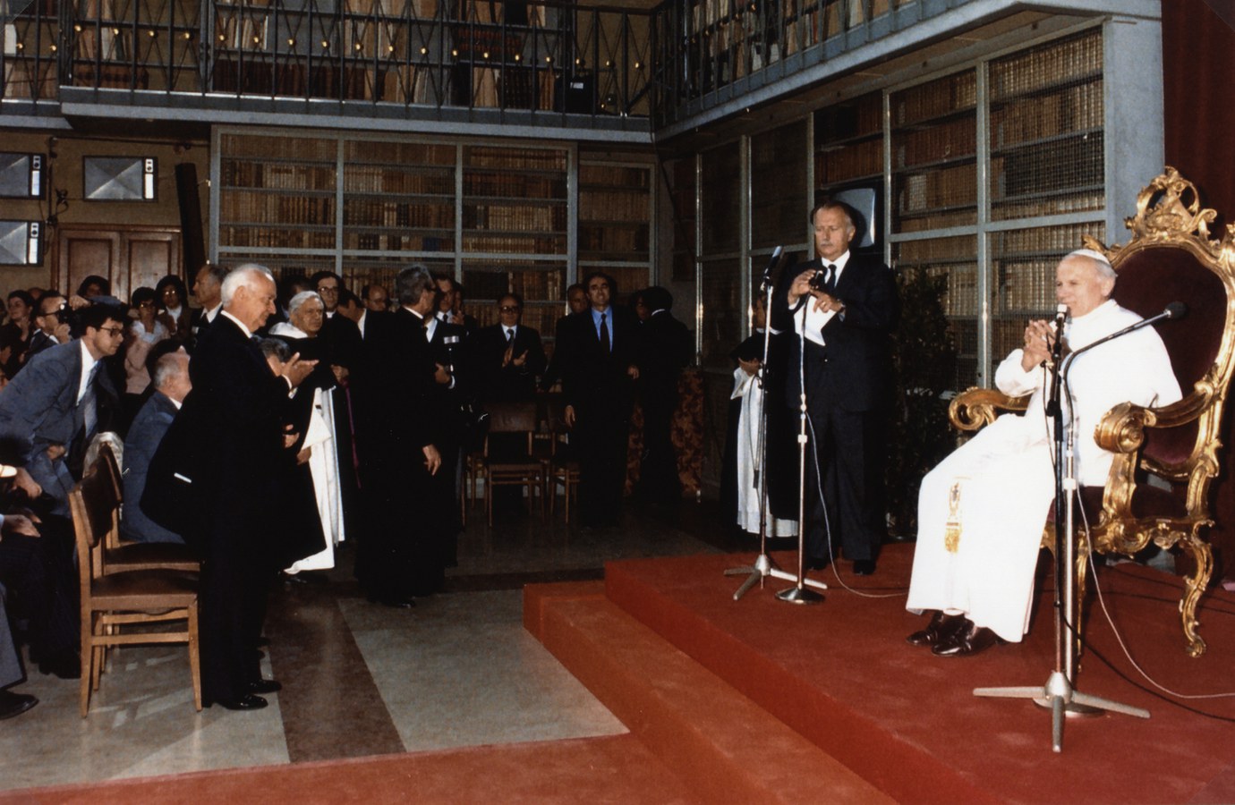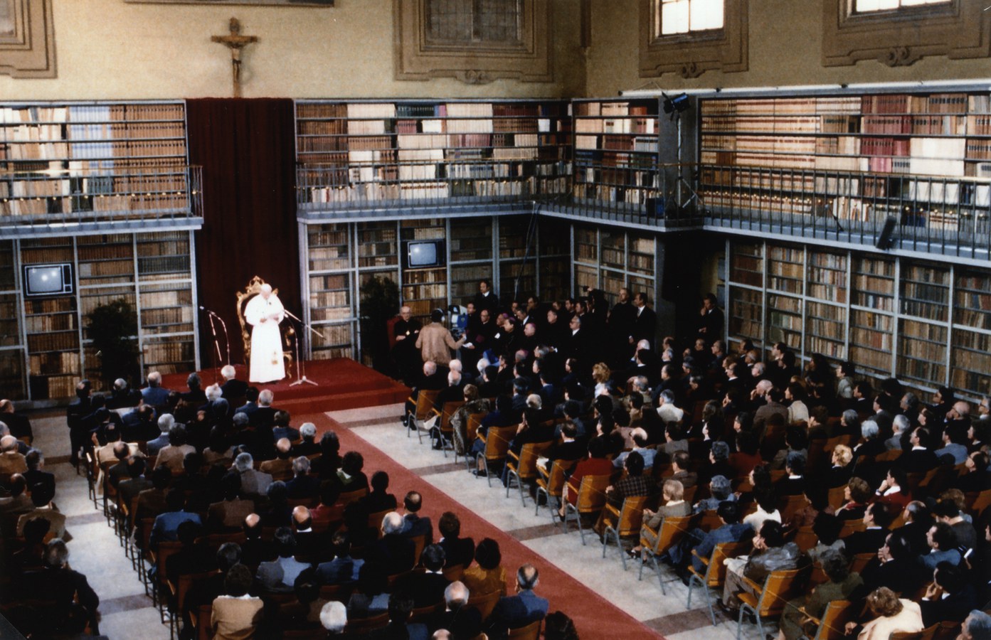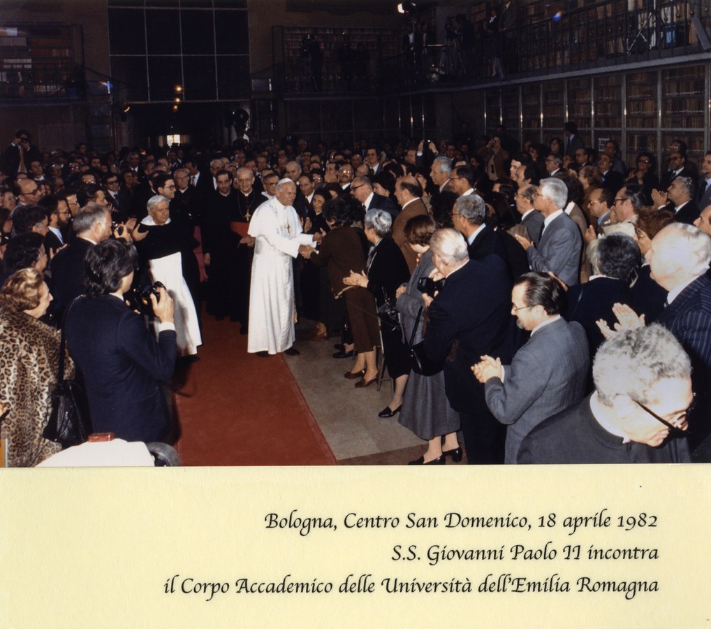 Visita pastorale del papa a Bologna. Giovanni Paolo II incontra i docenti delle quattro Università dell'Emilia Romagna (Ferrara, Modena e Reggio Emilia, Parma, Bologna) al Centro San Domenico di Bologna. Il papa è accolto in piazza Maggiore da centinaia di giovani che lo acclamano con canti e striscioni.