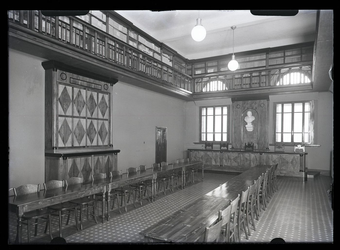 Descrizione: [Palazzo universitario - Accademia delle scienze: Sala delle adunanze della classe di scienze morali sottostante il magazzino librario / Anonimo]. - [1939]. - 1 fotografia: vetro, negativo, b/n ; 13 x 18 cm.