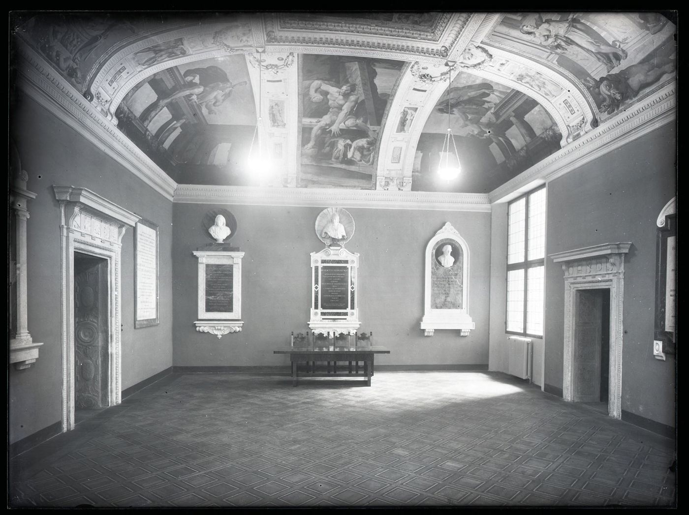 Descrizione: [Sala di Ulisse durante il restauro, a sinistra l’iscrizione celebrativa all’aggiunta classe di scienze morali, di fronte i monumenti commemorativi a Eustachio Manfredi, Benedetto XIV, e Luigi Palcani Caccianemici: Accademia delle scienze: via Zamboni 31, Bologna / Anonimo ; Pellegrino Tibaldi]. - [esecuzione 1932 circa]. - 1 fotografia: vetro, negativo, b/n ; 18 x 24 cm.