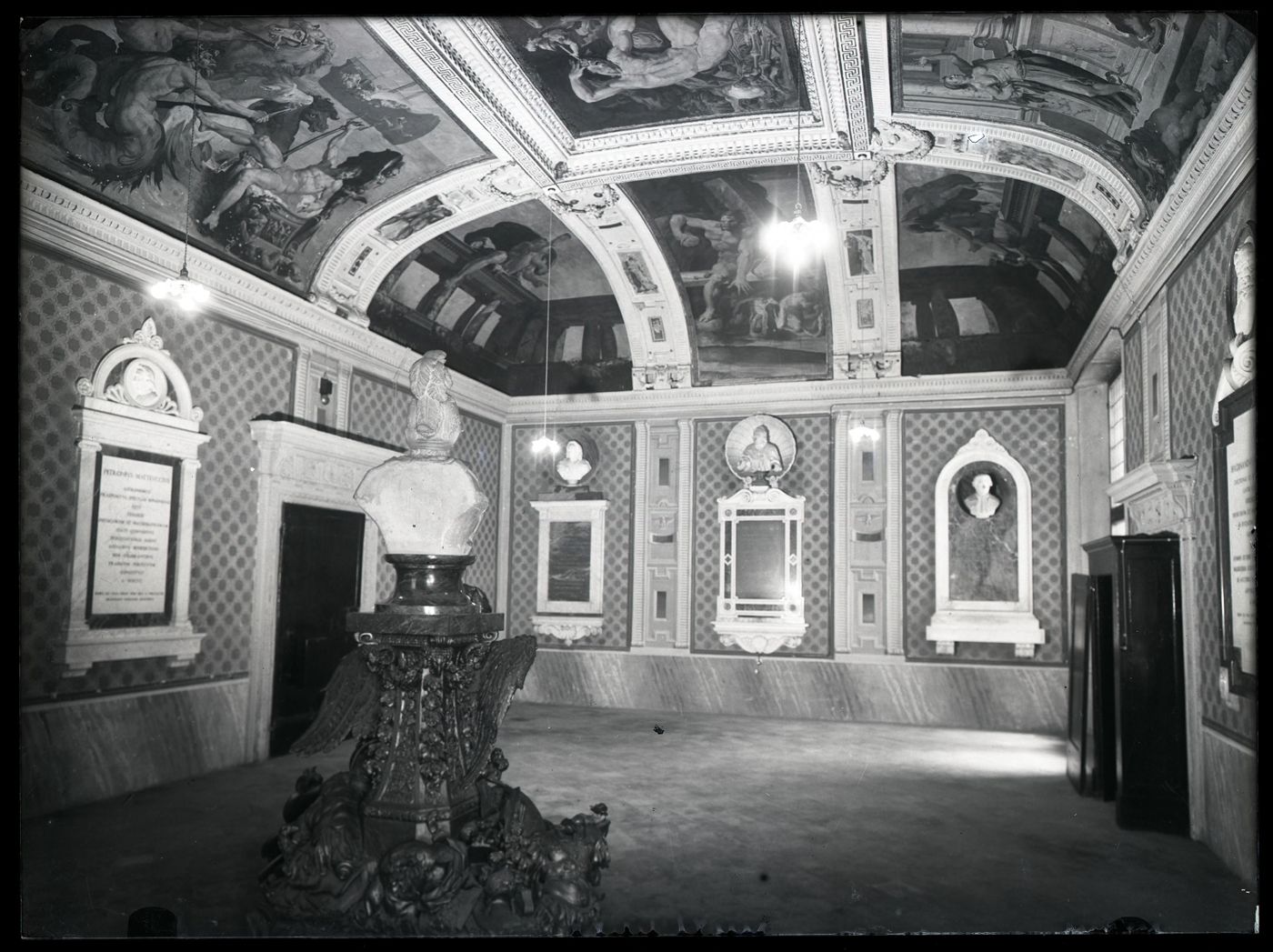 Descrizione: [Sala di Ulisse prima del restauro con il busto marmoreo su basamento ligneo di Luigi Ferdinando Marsili e i monumenti commemorativi, sul lato sinistro a Petronio Matteucci, di fronte a Eustachio Manfredi, Benedetto XIV e Luigi Palcani Caccianemici: Accademia delle scienze: via Zamboni 31, Bologna / Anonimo ; Pellegrino Tibaldi]. - [esecuzione 1930-1931]. - 1 fotografia: vetro, negativo, b/n ; 18 x 24 cm.