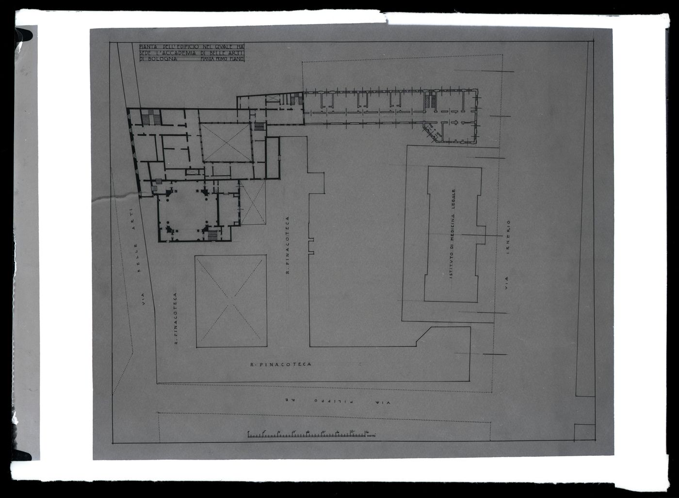 Descrizione: [Pianta dell'edificio nel quale ha sede l'Accademia di belle arti di Bologna: pianta primo piano / Anonimo]. - [esecuzione 1940 circa]. - 1 fotografia: vetro, negativo, b/n ; 13 x 18 cm.