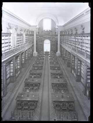 Descrizione: [Biblioteca universitaria: Grande sala di lettura già Aula magna - Costruita nel 1741 arch. Carlo Francesco Dotti - Donata da Benedetto XIV - (rest. A. X) / Anonimo]. - [1938]. - 1 fotografia: vetro, negativo, b/n ; 18 x 13 cm.
