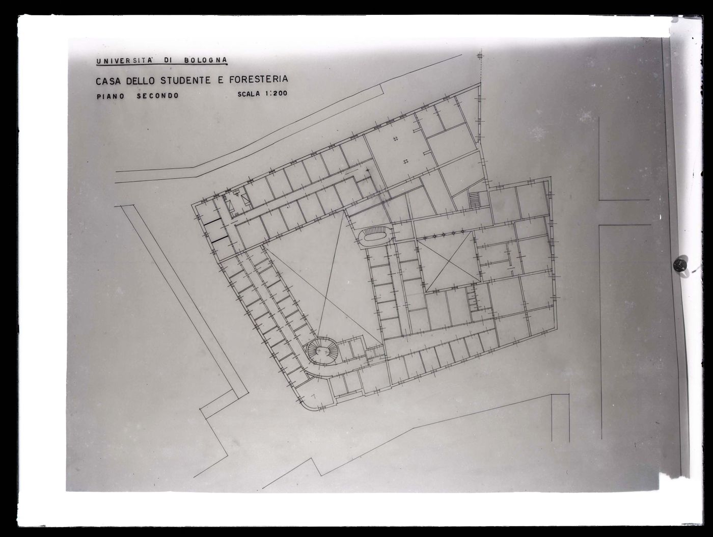 Descrizione: [Università di Bologna: Casa dello studente e Foresteria: piano secondo: scala 1:200 / Anonimo]. - [esecuzione 1936-1955]. - 1 fotografia: vetro, negativo, b/n ; 18 x 24 cm.