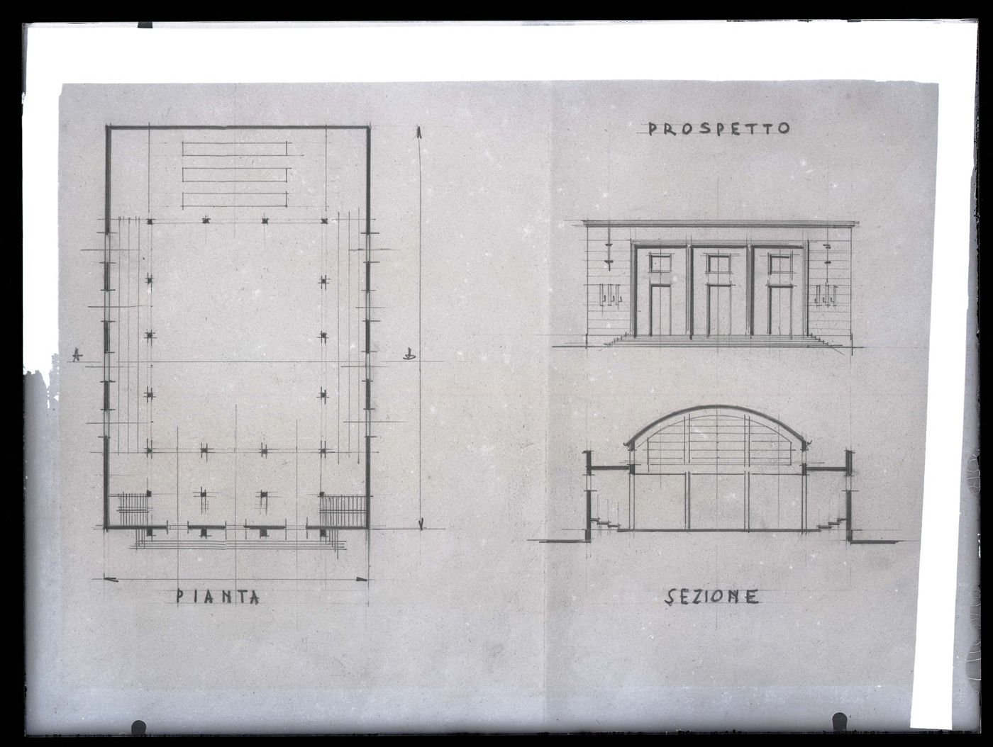 Descrizione: [Pianta, Prospetto, Sezione: Centro sportivo universitario / Anonimo]. - [esecuzione 1946-1955]. - 1 fotografia: vetro, negativo, b/n ; 18 x 24 cm.