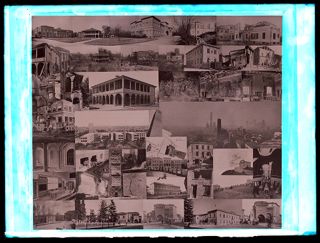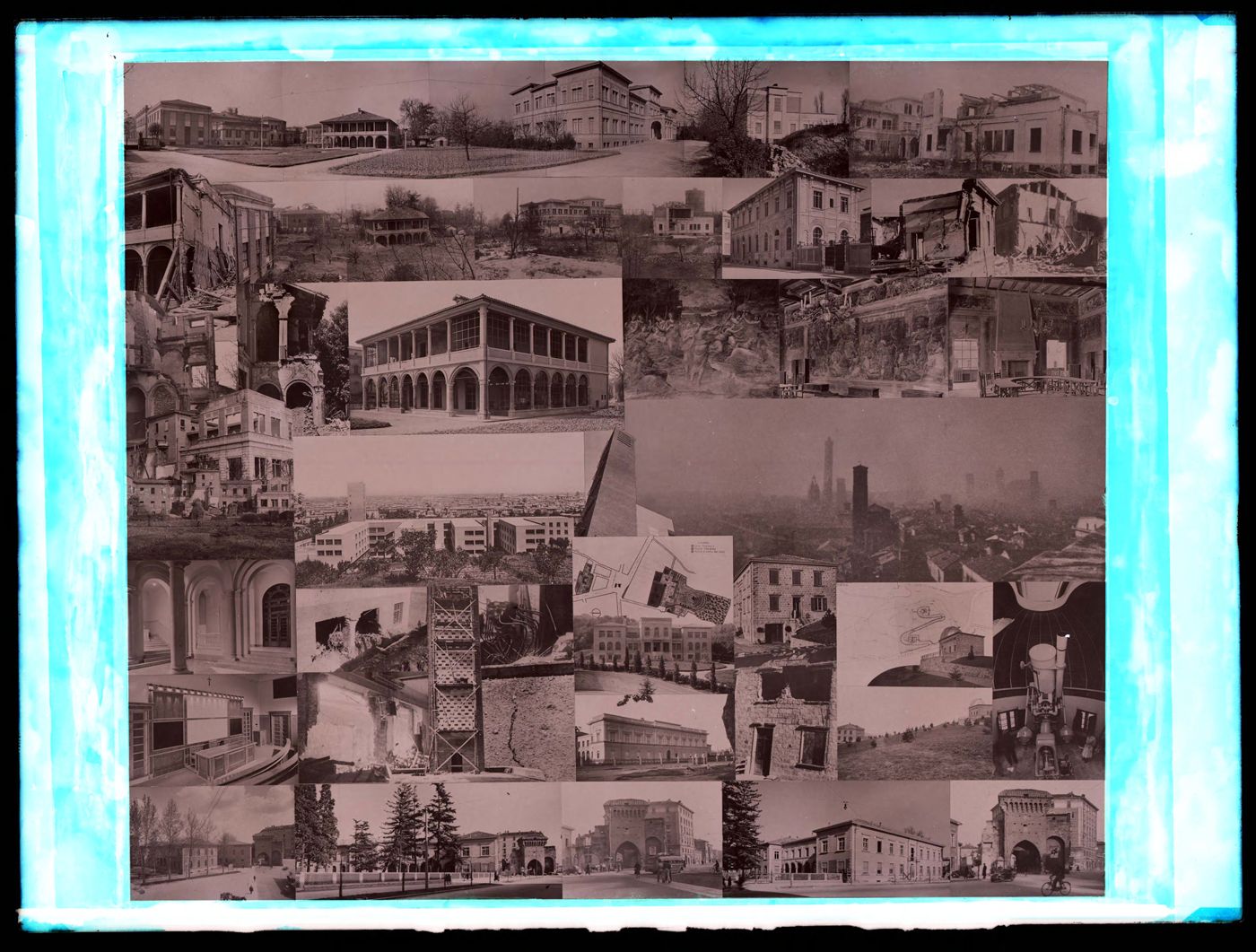 Descrizione: [Fotocollage di alcuni edifici universitari con i danni subiti dai bombardamenti aerei del 1944 e l'opera di ricostruzione / Anonimo]. - [esecuzione 1950-1955]. - 1 fotografia: vetro, negativo, b/n ; 18 x 24 cm.