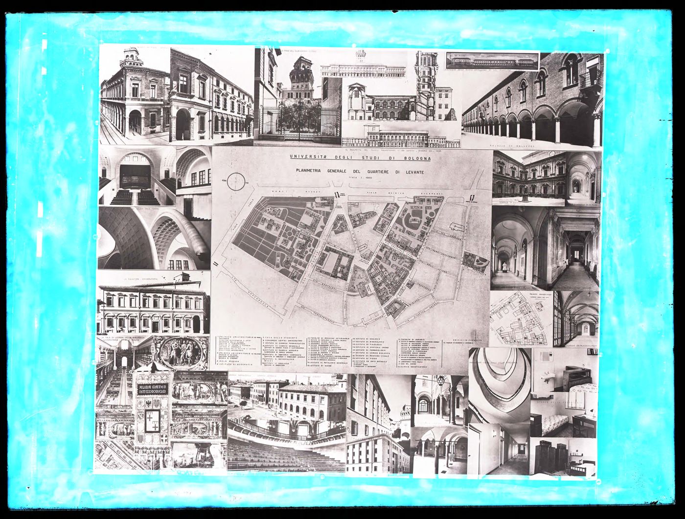 Note: Titolo dalla didascalia della planimetria; autore non identificato. - Data di esecuzione desunta dalla nuova denominazione di “Università degli studi” e compresa nella data di compilazione dell’inventario. - Al centro una planimetria, contornata da fotografie in piccolo formato, con titoli e note esplicative, di interni ed esterni del Palazzo Universitario, della Biblioteca Universitaria, degli istituti chimici e della Foresteria.