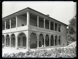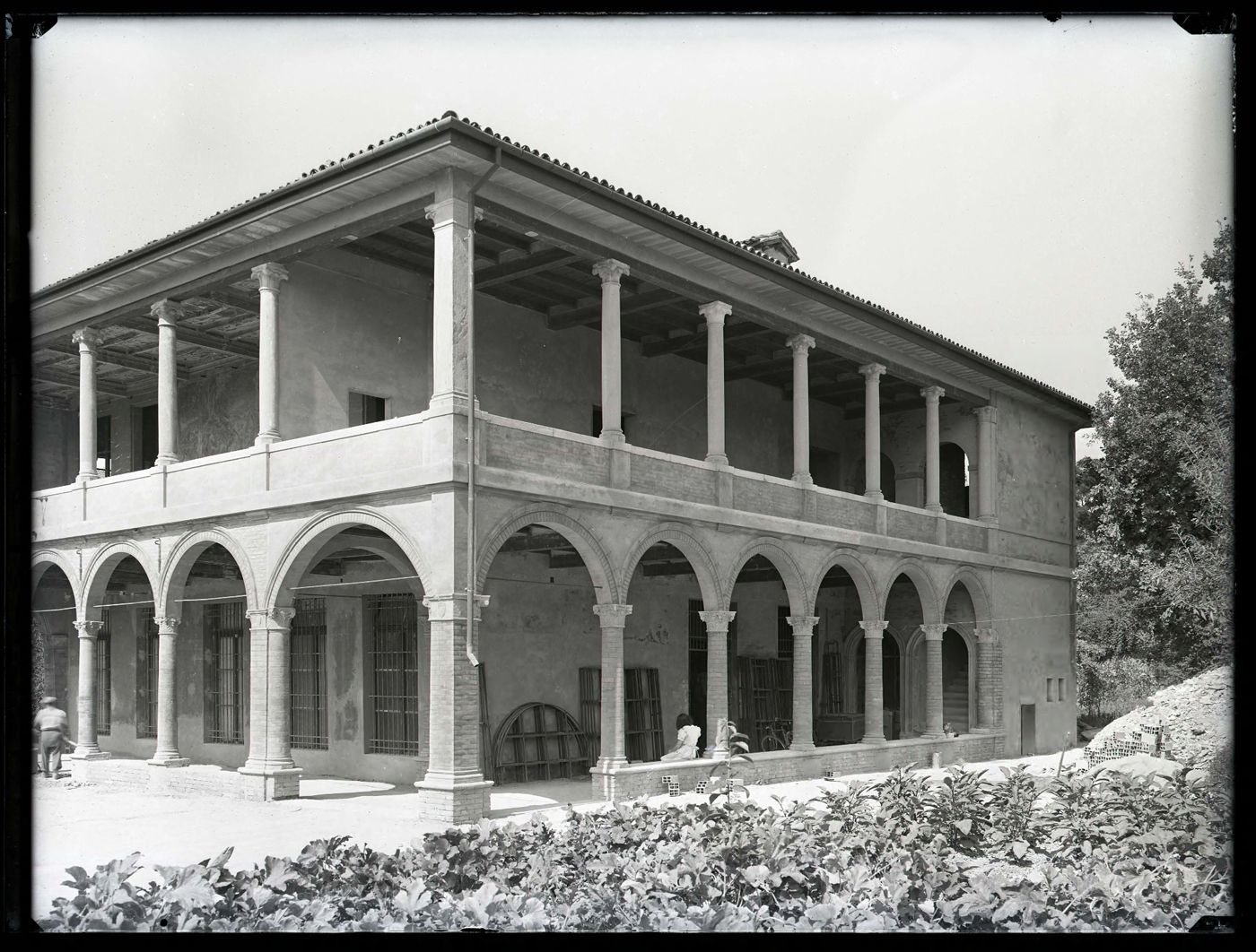 Note: Titolo attribuito; autore non identificato. - Data di esecuzione desunta dal contenuto; nei bombardamenti aerei del 22 giugno 1944 furono distrutti i loggiati sul lato nord e l'angolo nord-est. Il restauro, diretto da Guido Zucchini e Gustavo Rizzoli, inizia nel 1946 con i lavori di sottomurazione, consolidamento e ripristino delle parti antiche, e termina nel 1948 con il restauro degli affreschi. Alfredo Barbacci riferisce che tra il 1947 e il 1948 vengono eseguiti significativi interventi sulle opere pittoriche interne, tra cui gli affreschi di Prospero Fontana (Storie di Costantino e Papa Silvestro) e il fregio di Nicolò dell'Abate. Gli affreschi di Innocenzo da Imola conservati nella loggia furono restaurati dal pittore Dante De Carolis, cfr. Monumenti di Bologna : distruzioni e restauri / Alfredo Barbacci. - Bologna : Cappelli, [1977], p. 62 e nota 29. - La fotografia attesta la scomparsa del rilievo, posto sopra i due accessi nel loggiato del piano inferiore, documentato nella lastra EDIUNIBO F. Agraria 076. La ricostruzione del lato nord ha comportato la rimozione o la distruzione del monumento commemorativo a Bonifacio Ferrero.