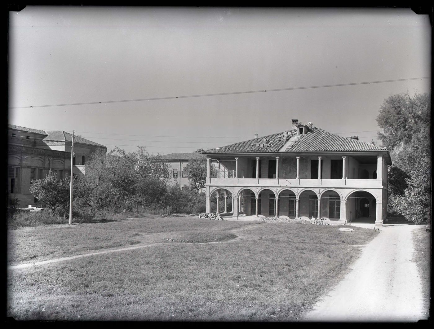 Descrizione: [Veduta della facciata della Palazzina della Viola durante il restauro: Facoltà di Agraria: via Filippo Re 4, Bologna / Anonimo]. - [esecuzione 1946-1948]. - 1 fotografia: vetro, negativo, b/n ; 18 x 24 cm.